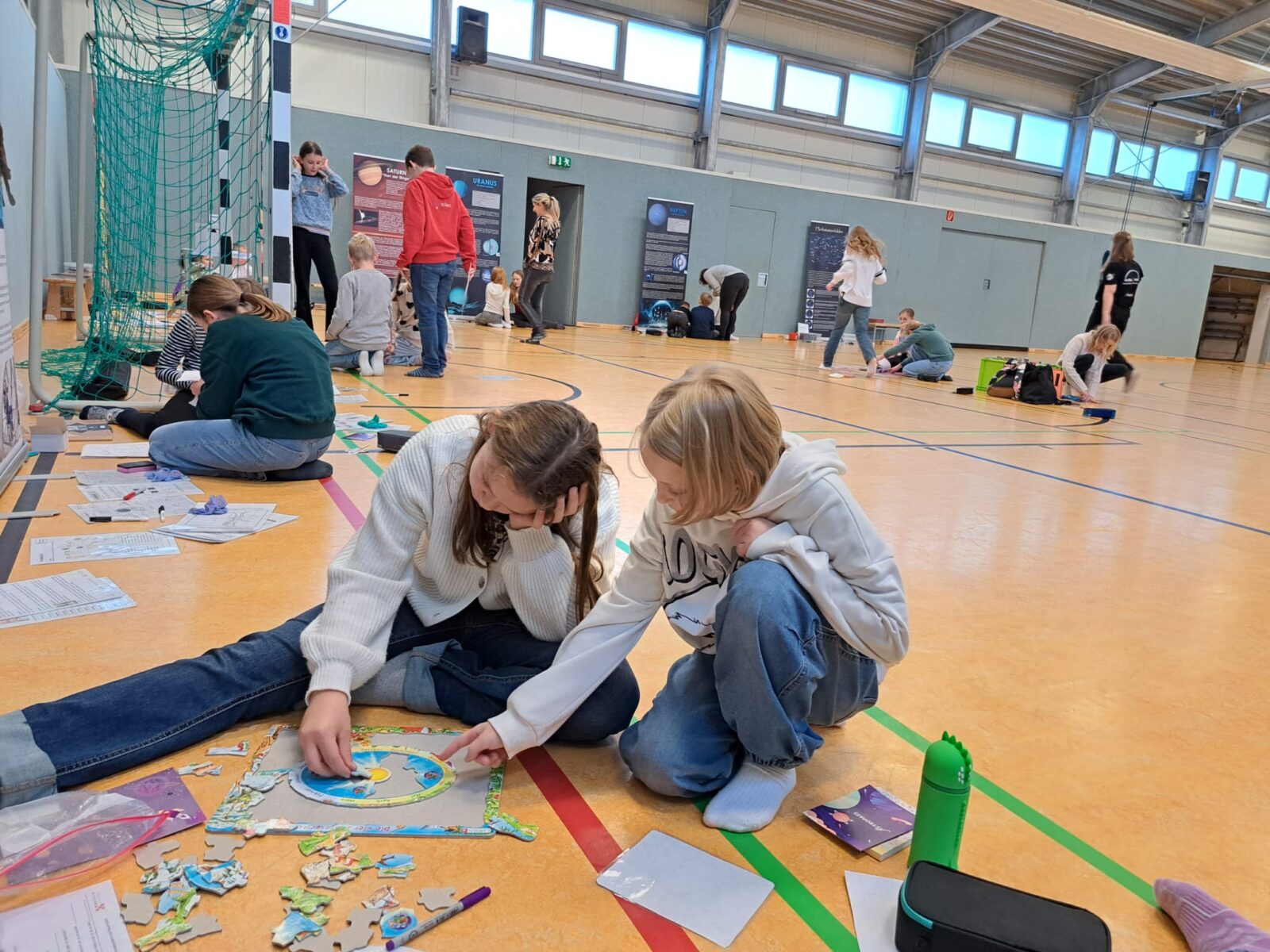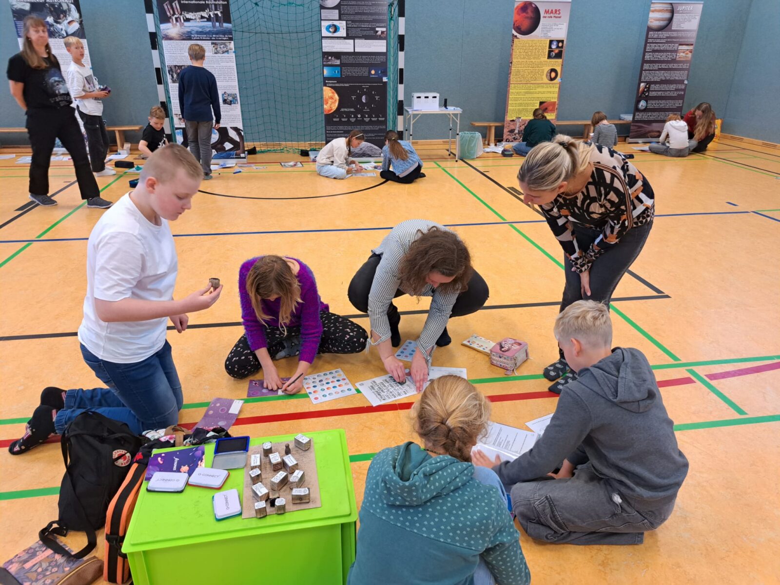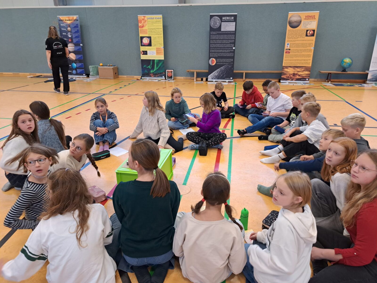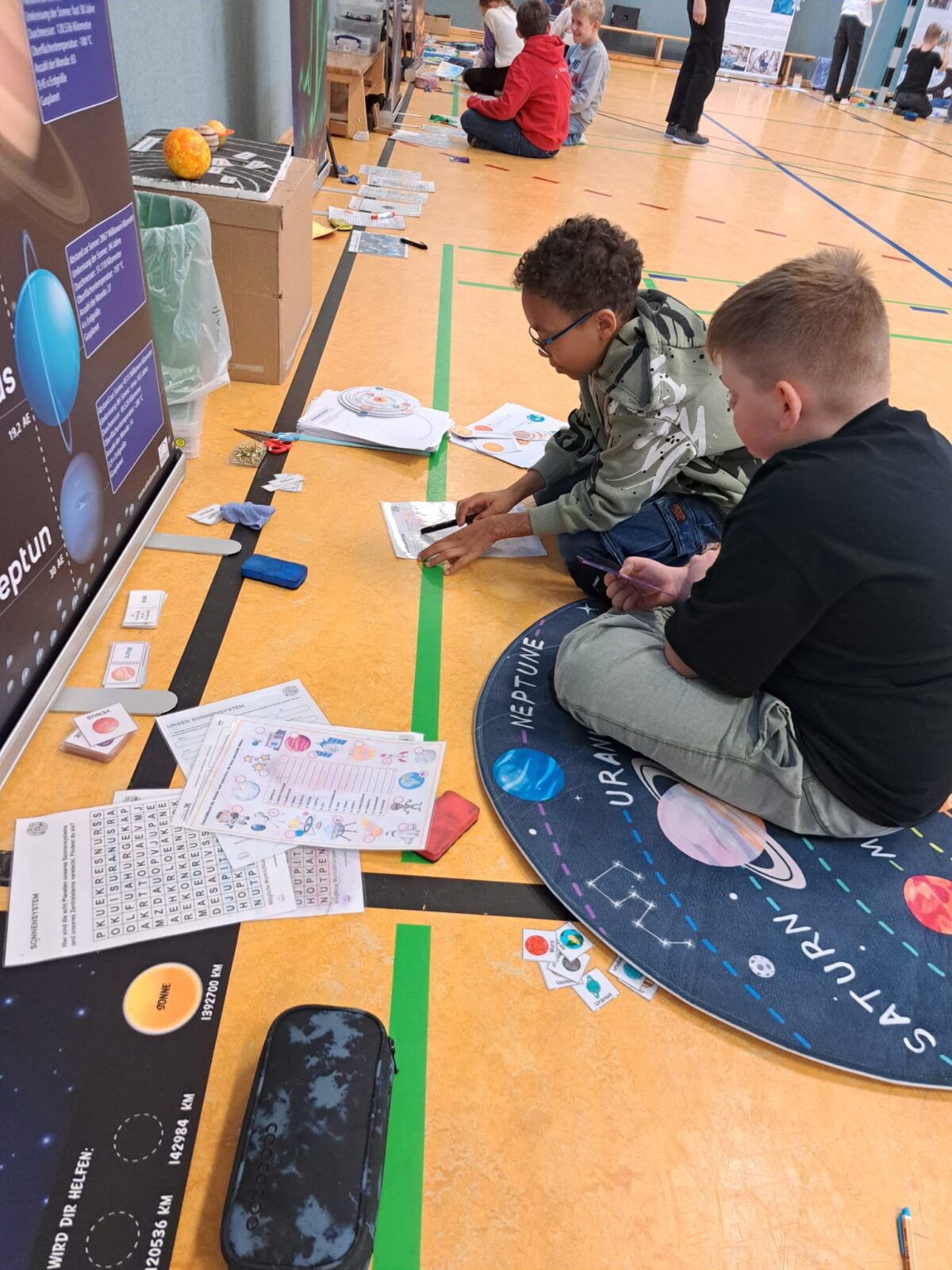 Dort erwartete uns als Erstes eine sehr interessante Lernwerkstatt. An verschiedenen Stationen konnten wir uns mit dem Kosmos vertraut machen. Es gab Lesetafeln mit interessanten Bildern, Fotos und Informationen zu den Planeten unseres Sonnensystems. In kleinen Gruppen lösten wir originelle Aufgaben, die schriftlich oder kreativ als Bastelaufgabe oder Puzzle absolviert werden mussten. Im Anschluss konnte jeder Schüler die Richtigkeit seiner Lösungen überprüfen und sich selbst seinen Erfolg mit einem Stempel in ein persönliches Faltblatt quittieren.