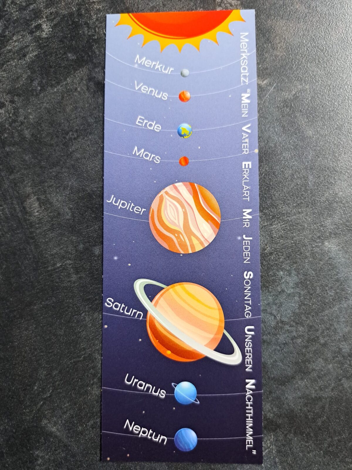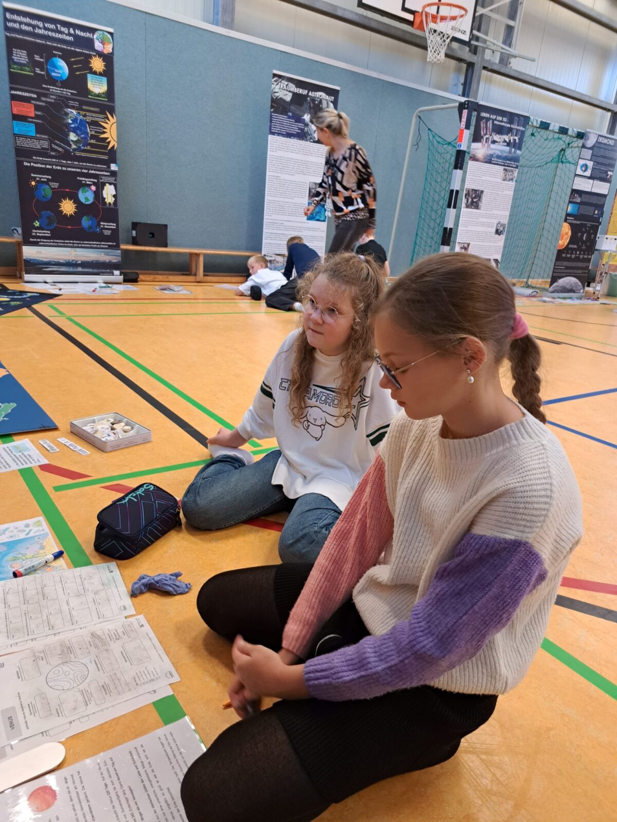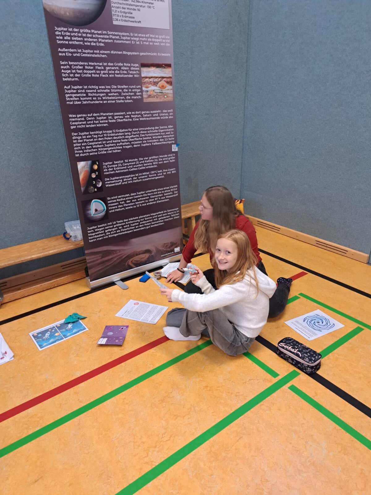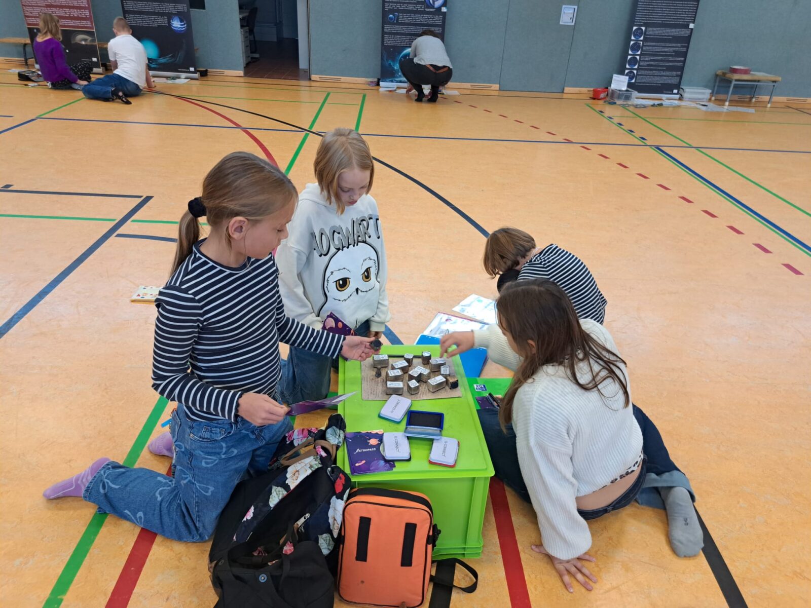 Dort erwartete uns als Erstes eine sehr interessante Lernwerkstatt. An verschiedenen Stationen konnten wir uns mit dem Kosmos vertraut machen. Es gab Lesetafeln mit interessanten Bildern, Fotos und Informationen zu den Planeten unseres Sonnensystems. In kleinen Gruppen lösten wir originelle Aufgaben, die schriftlich oder kreativ als Bastelaufgabe oder Puzzle absolviert werden mussten. Im Anschluss konnte jeder Schüler die Richtigkeit seiner Lösungen überprüfen und sich selbst seinen Erfolg mit einem Stempel in ein persönliches Faltblatt quittieren.