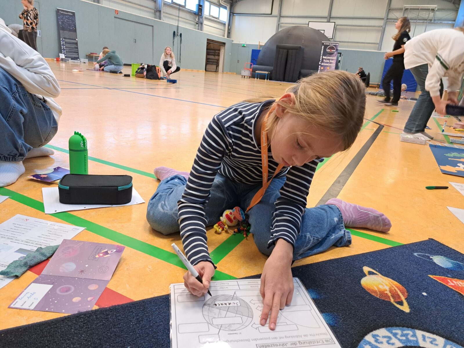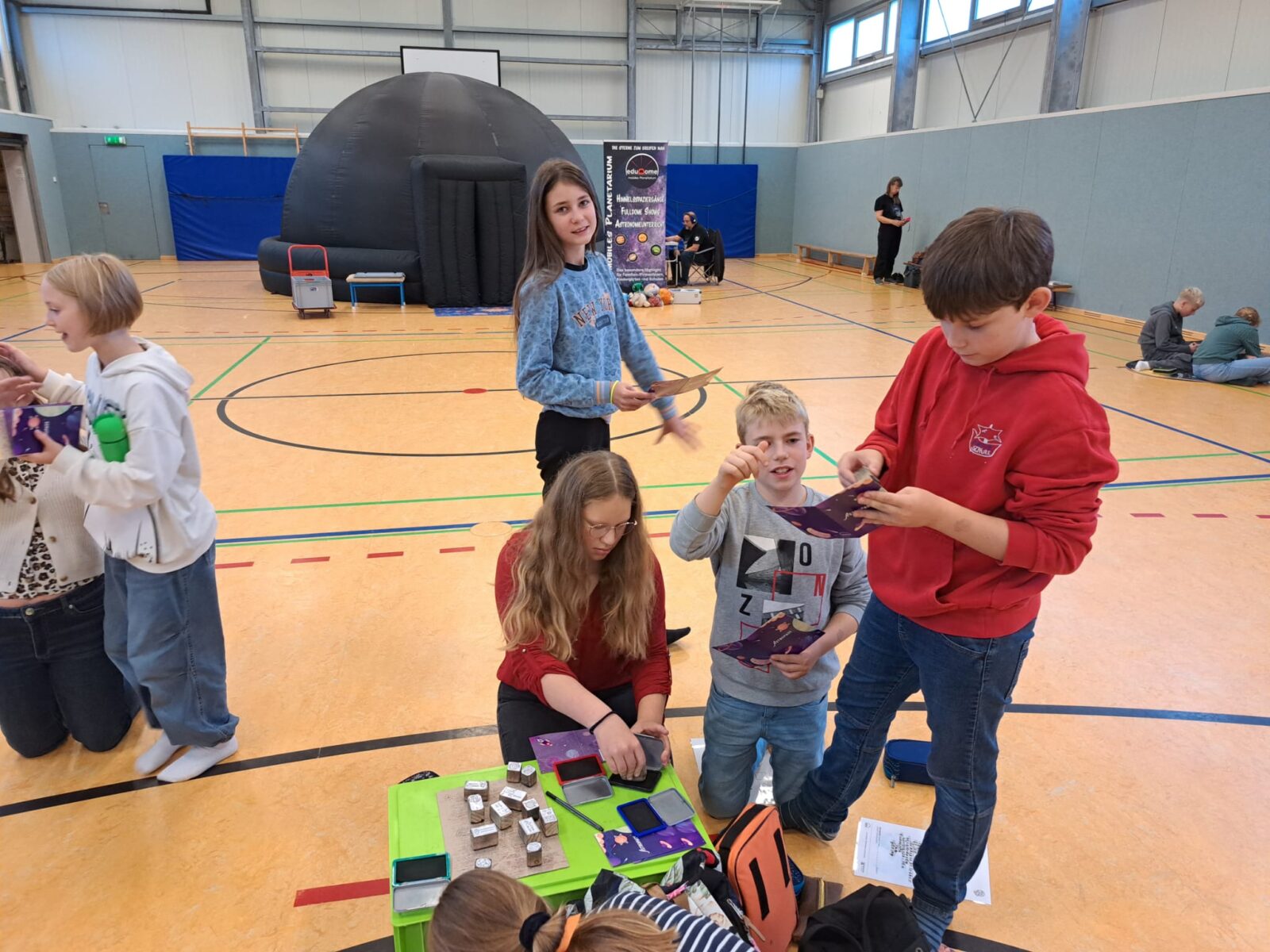Doch das Schönste war das „Sternentheater“ im Anschluss. Mit Kopfhörern und Kissen versehen, legten wir uns in ein Zelt, das in der Mitte der Sporthalle aufgebaut war und genossen die 45-minütige Filmshow mit der Reise ins Weltall und zu den erdnahen Planeten.