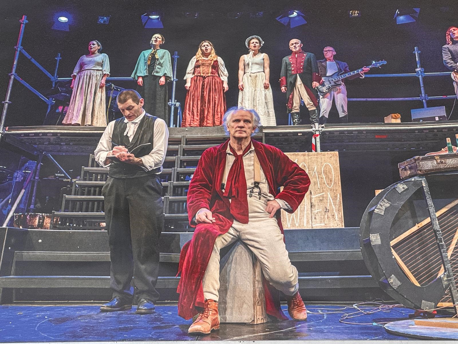 Mit kurzem Zwischenstop in Möllenhagen, ging es weiter nach Berlin. Schon die Hinfahrt war ein Erlebnis. Wir hatten einen sehr netten und coolen Busfahrer. Wir durften auf 2 großen Bildschirmen des Busses einen Film schauen. Angekommen in Berlin haben wir in dem Theater viel über Beethovens Leben erfahren dürfen und nach der Veranstaltung durften wir sogar auf die Bühne und ein gemeinsames Foto mit dem Beethoven-Darsteller machen und haben zusammen das Lied „Freude schöner Götterfunken“ gesungen.